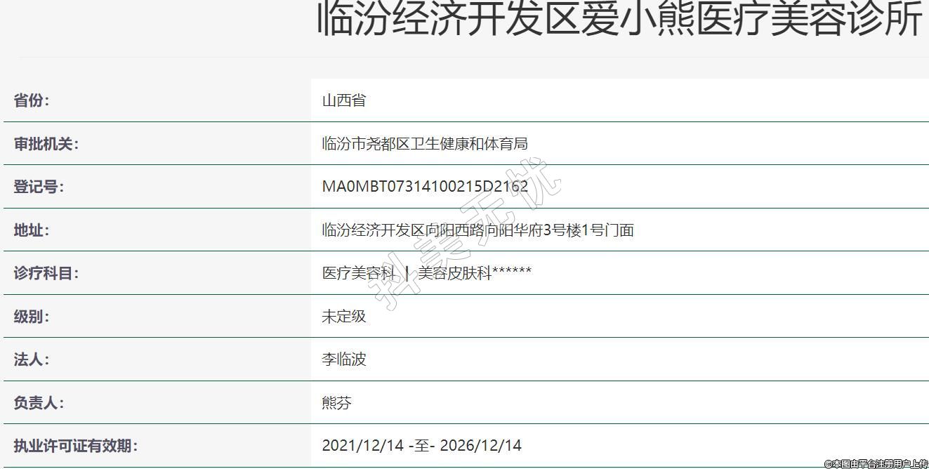 臨汾愛小熊醫(yī)療美容成立于2021-08-03,地址:臨汾經(jīng)濟(jì)開發(fā)區(qū)向陽西路向陽華府3號(hào)樓1號(hào)門面,診療科目:醫(yī)療美容科 | 美容皮膚科******