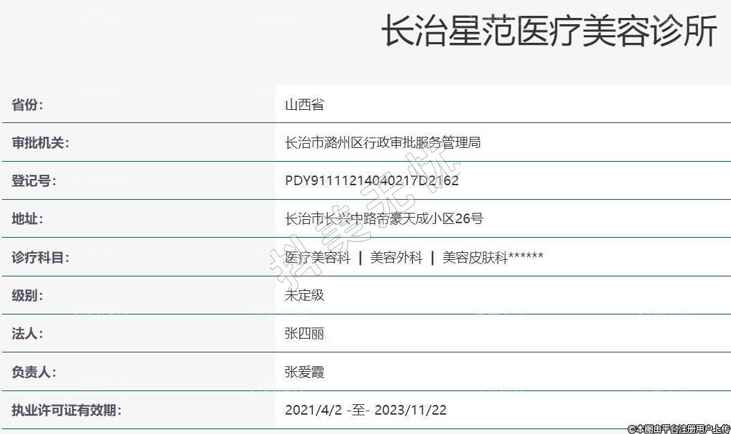 長(zhǎng)治星范醫(yī)療美容成立于2018-06-04,地址:長(zhǎng)治市長(zhǎng)興中路帝豪天成小區(qū)26號(hào),診療科目:醫(yī)療美容科 | 美容外科 | 美容皮膚科******