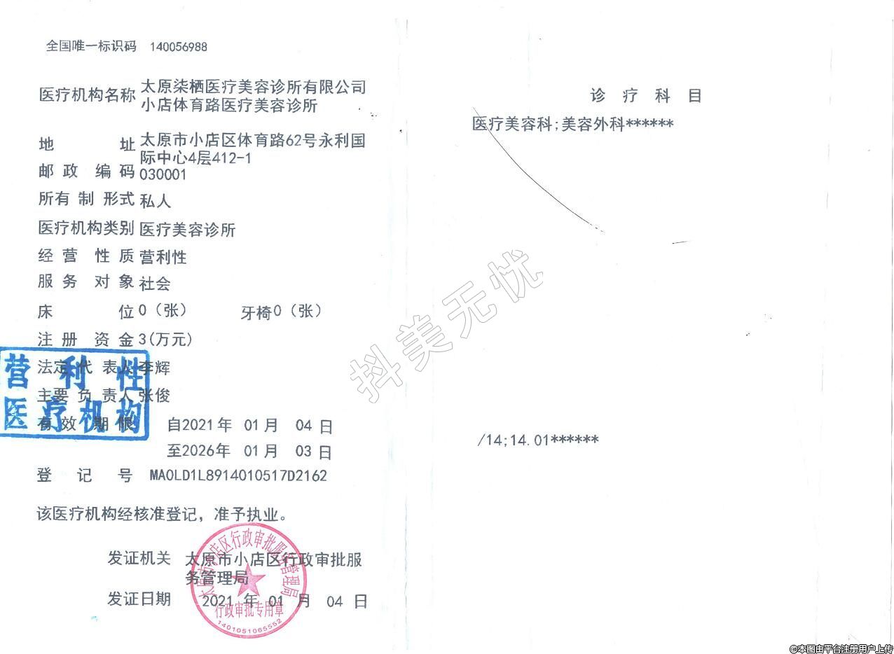 醫(yī)療機構名稱:太原染棲醫(yī)療美容診所有限公司小店體育路醫(yī)療美容診所