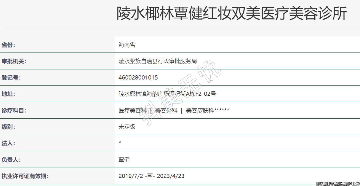 陵水椰林覃健紅妝雙美醫(yī)療美容2022-06-01成立,地址:陵水椰林鎮(zhèn)海韻廣場(chǎng)酒吧街A棟F2-02號(hào),診療科目:醫(yī)療美容科 | 美容外科 | 美容皮膚科******
