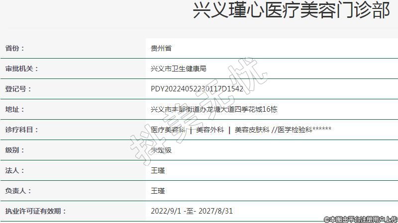 興義瑾心醫(yī)療美容2022年07月27日成立,地址:興義市豐都街道辦龍?zhí)链蟮浪募净ǔ?6棟,診療科目:醫(yī)療美容科 | 美容外科 | 美容皮膚科 //醫(yī)學檢驗科******