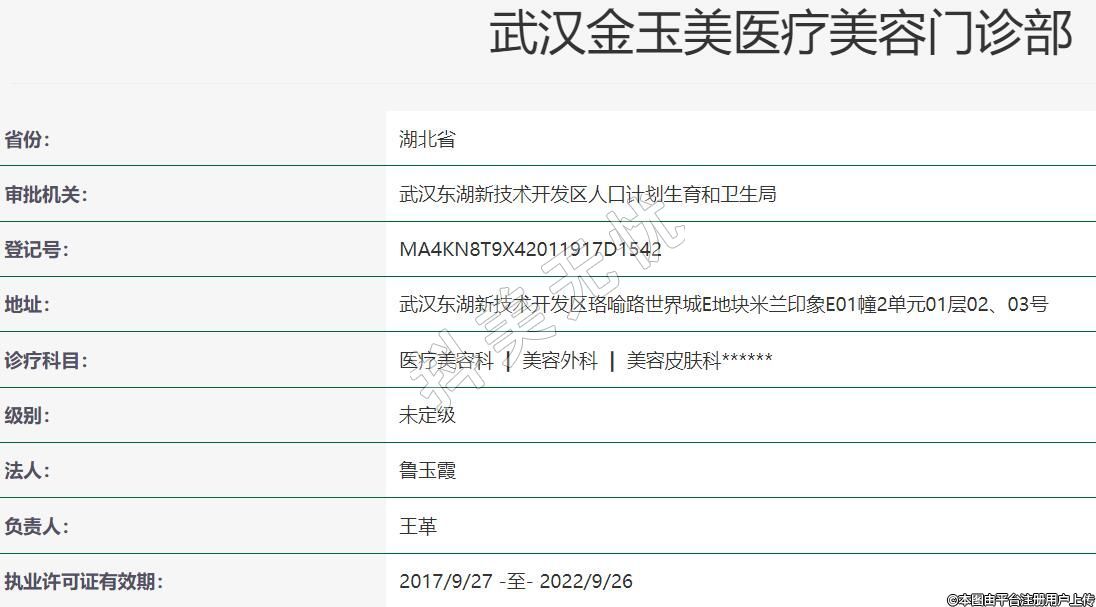 武漢金玉美醫(yī)療美容2016年08月05日成立,地址:武漢東湖新技術(shù)開發(fā)區(qū)珞喻路世界城E地塊米蘭印象E01幢2單元01層02、03號,診療科目:醫(yī)療美容科 | 美容外科 | 美容皮膚科******