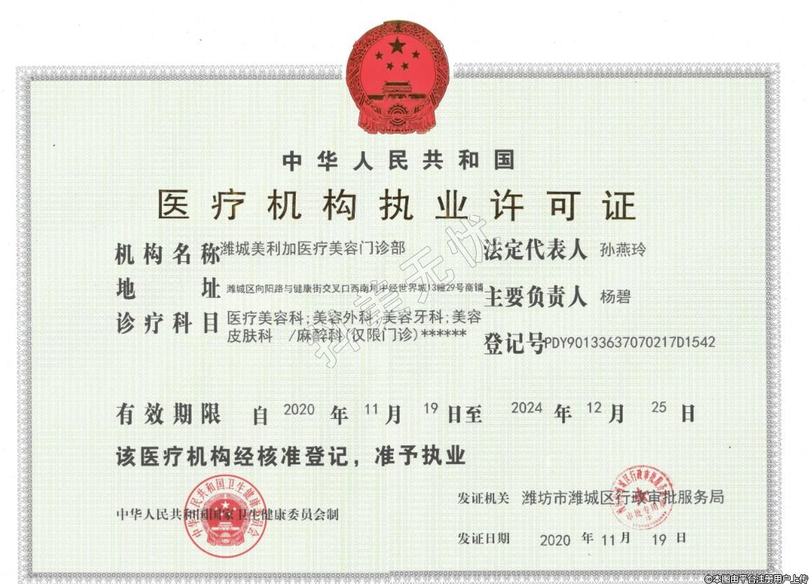 濰坊美利加醫(yī)療美容2019年10月09日成立,地址:濰城區(qū)向陽路與健康街交叉口西南角中經(jīng)世界城13幢29號商鋪,診療科目:醫(yī)療美容科;美容外科;美容牙科;美容皮膚科/麻醉科(僅限門診)******
