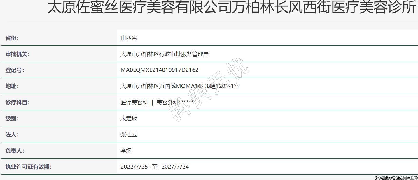 太原佐蜜絲醫(yī)療美容2022年05月23日成立,地址:太原市萬柏林區(qū)萬國城MOMA16號8幢1201-1室,診療科目:醫(yī)療美容科 | 美容外科******