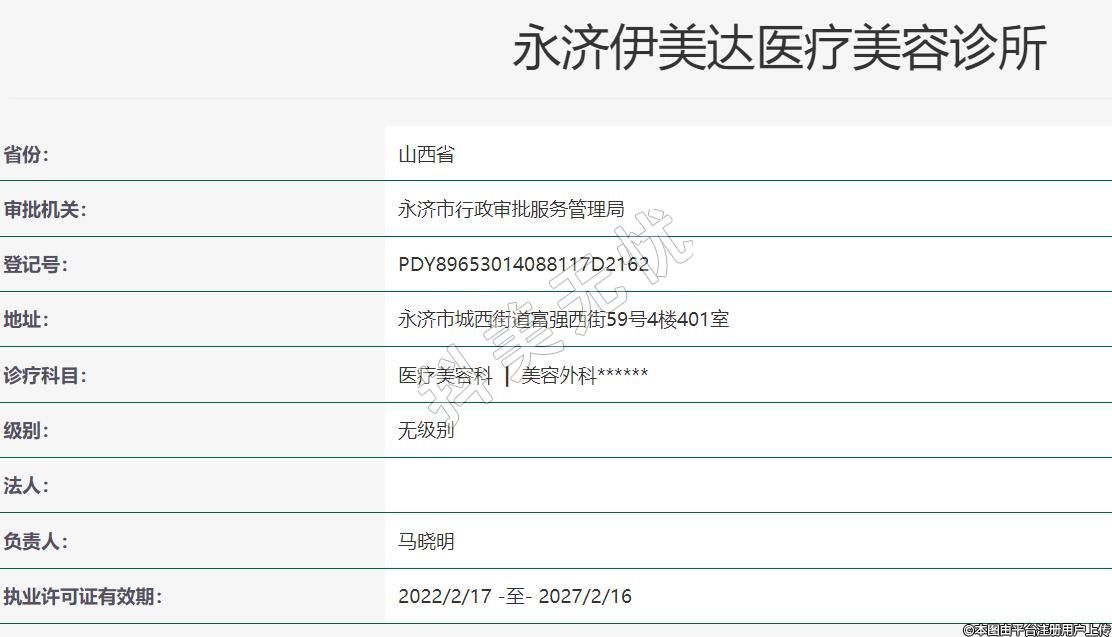 永濟伊美達醫(yī)療美容2021年11月11日成立,地址:永濟市城西街道富強西街59號4樓401室,診療科目:醫(yī)療美容科 | 美容外科******