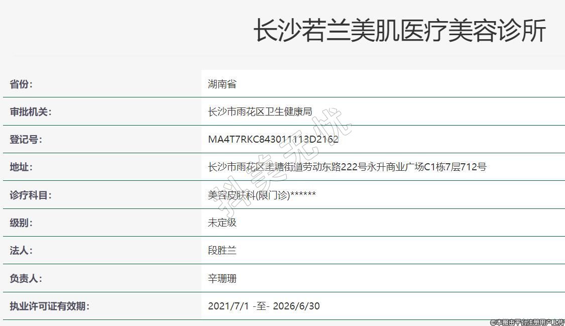 長沙若蘭美肌醫(yī)療美容2021年04月02日成立,地址:長沙市雨花區(qū)圭塘街道勞動東路222號永升商業(yè)廣場C1棟7層712號,診療科目:美容皮膚科(限門診)******