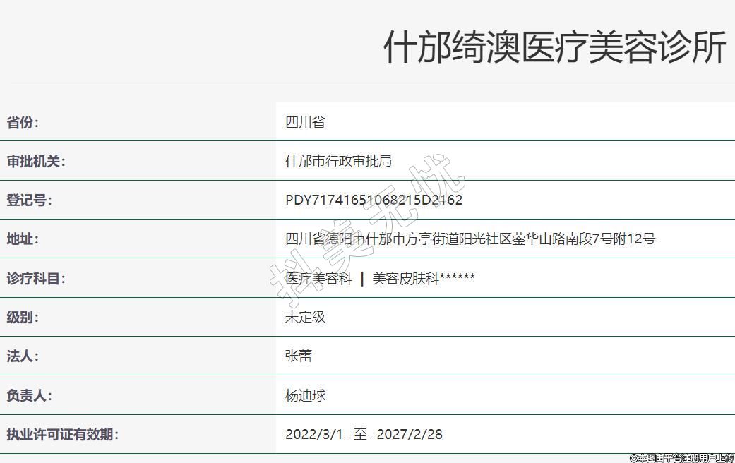 什邡綺澳醫(yī)療美容2021年12月17日成立,地址:四川省德陽市什邡市方亭街道陽光社區(qū)鎣華山路南段7號附12號,診療科目:醫(yī)療美容科 | 美容皮膚科******