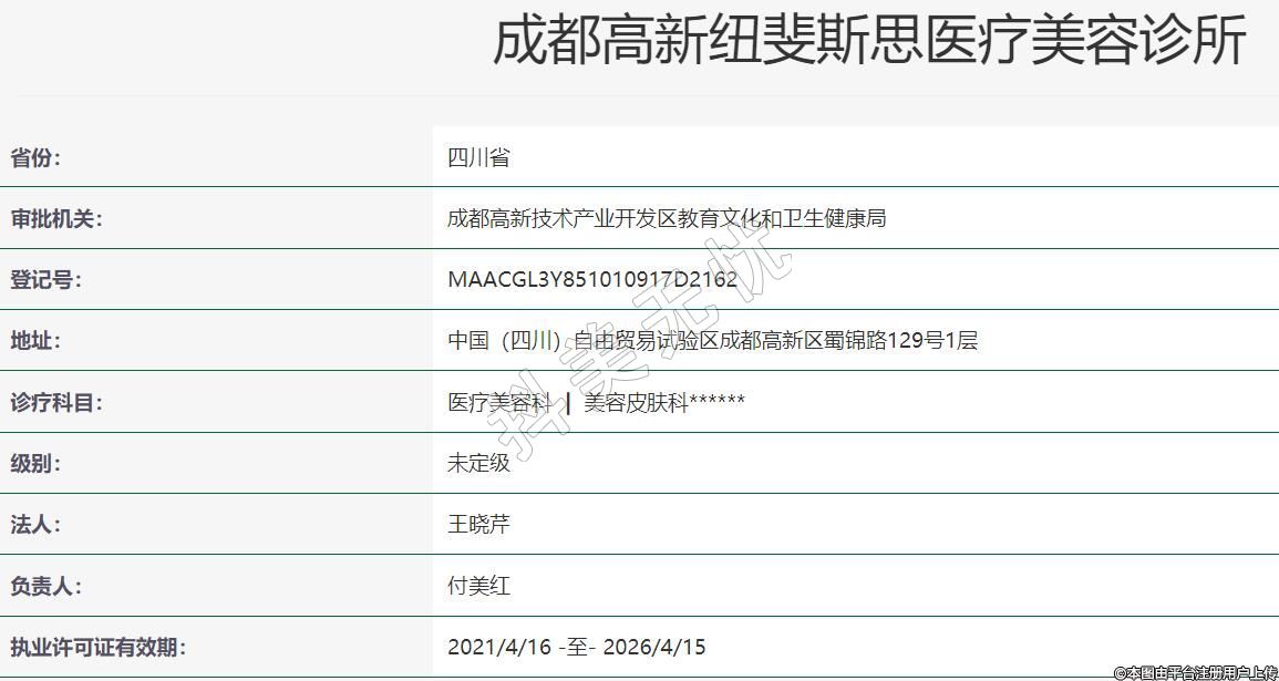 成都紐斐斯思醫(yī)療美容2021年03月22日成立,地址:中國(四川)自由貿易試驗區(qū)成都高新區(qū)蜀錦路129號1層,診療科目:醫(yī)療美容科 | 美容皮膚科******