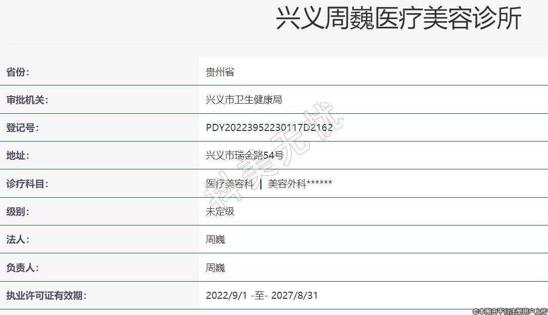 興義周巍醫(yī)療美容2022-09-09成立,地址:興義市瑞金路54號,診療科目:醫(yī)療美容科 | 美容外科******