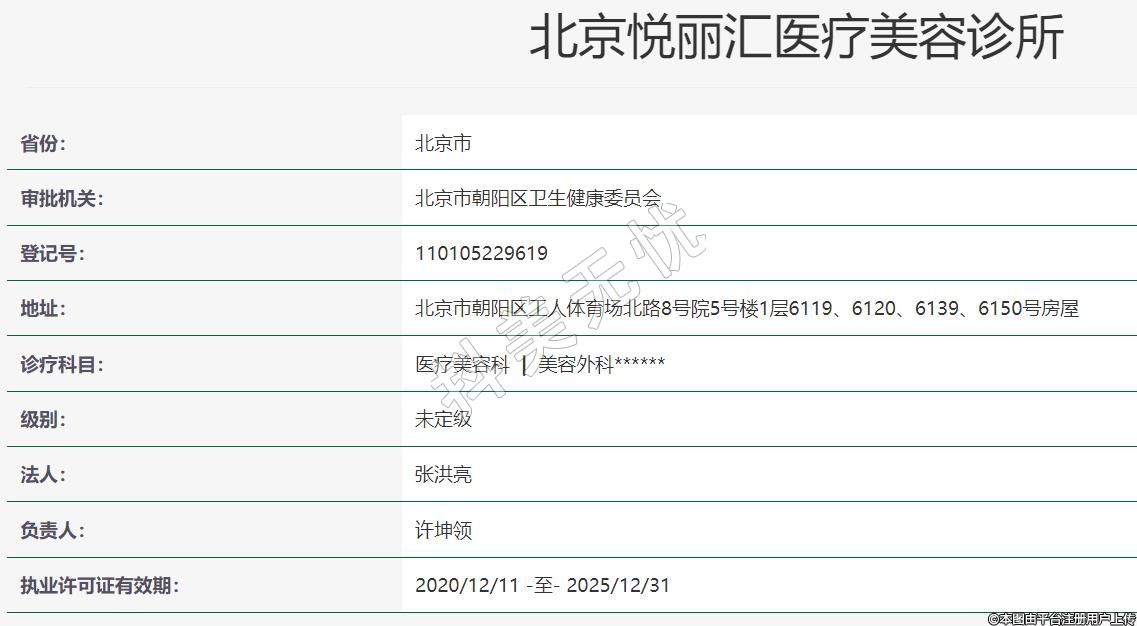 北京悅麗匯醫(yī)療美容2014-09-10成立,地址:北京市朝陽區(qū)工人體育場北路8號院5號樓1層6119、6120、6139、6150號房屋,診療科目:醫(yī)療美容科 | 美容外科******
