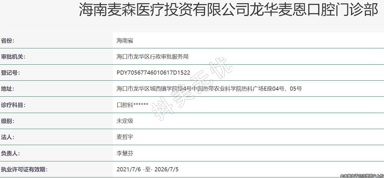 海南麥森醫(yī)療投資有限公司龍華麥恩口腔門診部