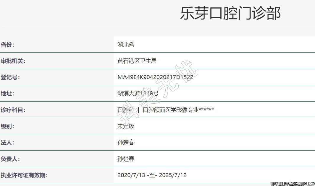 黃石樂芽口腔2019年12月31日成立,地址:湖濱大道1218號,診療科目:口腔科 | 口腔頜面醫(yī)學影像專業(yè)******