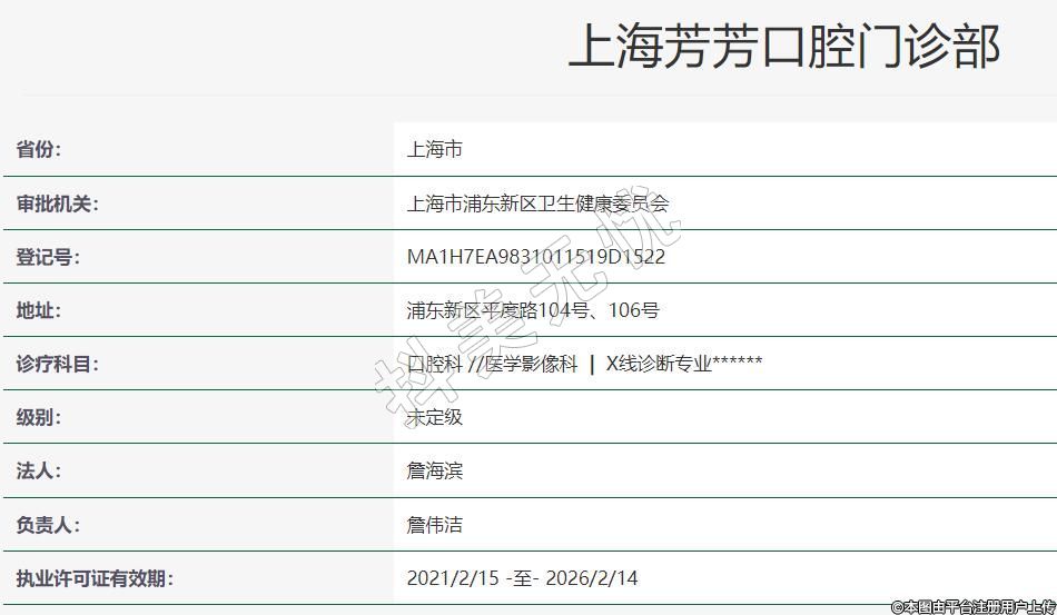 上海芳芳口腔位于上海市浦東新區(qū)平度路104號106號,金橋公園西門附近。機構于2002年成立上海黃金芳口腔診所,經過19年的服務,在周邊贏得了較強的聲譽。2015年經上海市浦東新區(qū)衛(wèi)生局批準,升級為口腔門診部,現(xiàn)有六臺牙椅,2020年11月被鑫齒口腔連鎖收購。