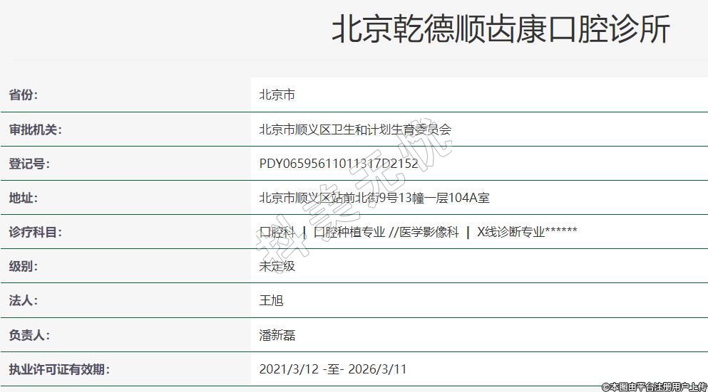 北京乾德順齒康口腔2020-10-12成立,地址:北京市順義區(qū)站前北街9號13幢一層104A室,診療科目:口腔科 | 口腔種植專業(yè) //醫(yī)學影像科 | X線診斷專業(yè)******