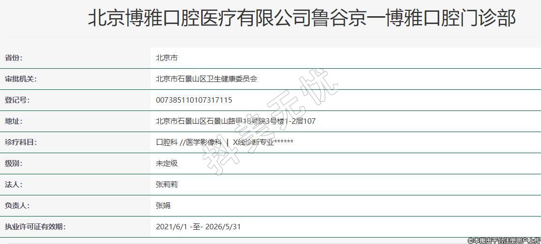 北京京一博雅口腔(魯谷)2016-05-18成立,地址:北京市石景山區(qū)石景山路甲18號院3號樓1-2層107,診療科目:口腔科 //醫(yī)學(xué)影像科 | X線診斷專業(yè)******
