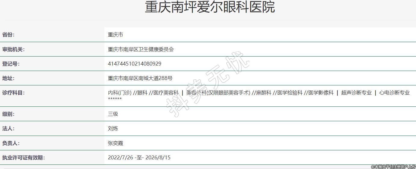 重慶南坪愛爾眼科2011-09-30成立,地址:重慶市南岸區(qū)南城大道288號,診療科目:內(nèi)科(門診) //眼科 //醫(yī)療美容科 | 美容外科(僅限眼部美容手術(shù)) //麻醉科 //醫(yī)學(xué)檢驗科 //醫(yī)學(xué)影像科 | 超聲診斷專業(yè) | 心電診斷專業(yè)******