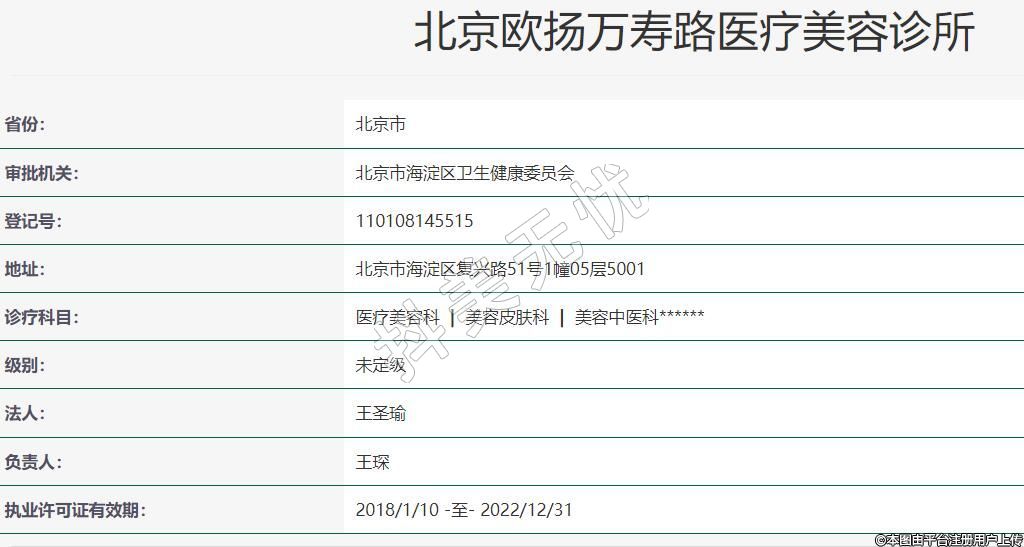 北京歐揚萬壽路醫(yī)療美容2017-09-22成立,地址:北京市海淀區(qū)復興路51號1幢05層5001,診療科目:醫(yī)療美容科 | 美容皮膚科 | 美容中醫(yī)科******