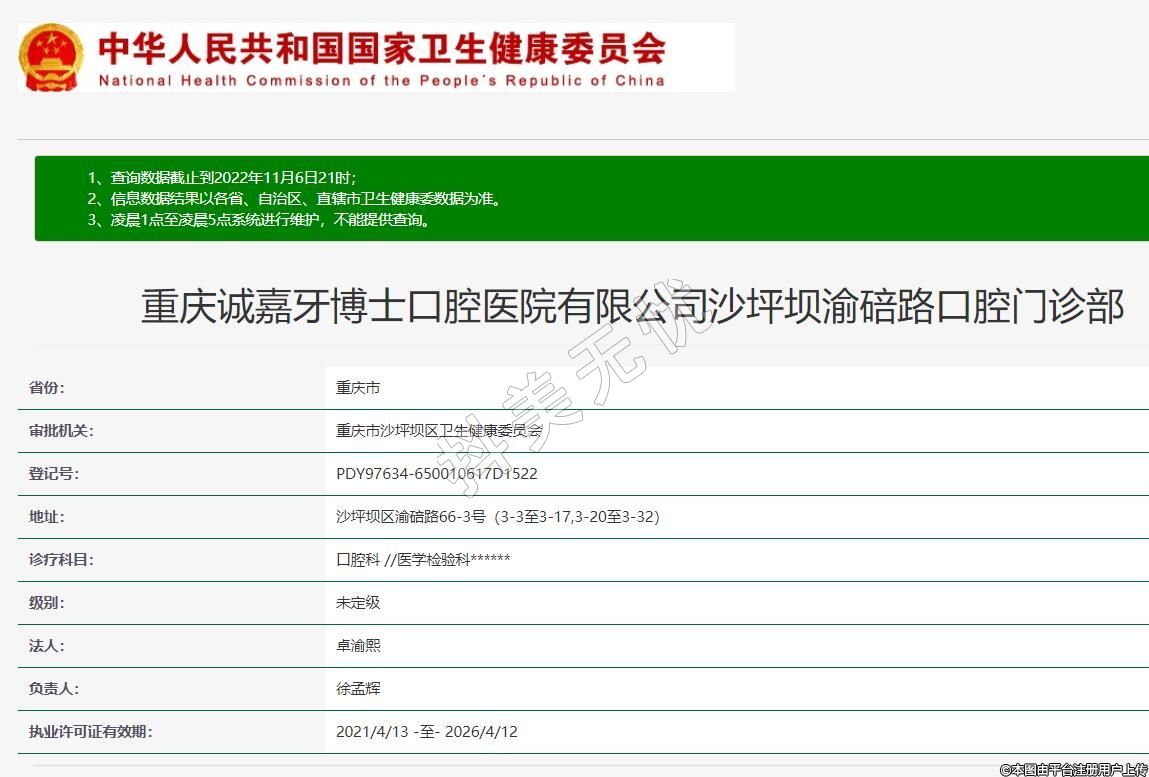 重慶誠嘉牙博士口腔(渝碚路口)2020-10-20成立,地址:沙坪壩區(qū)渝碚路66-3號(3-3至3-17,3-20至3-32),診療科目:口腔科 //醫(yī)學檢驗科******