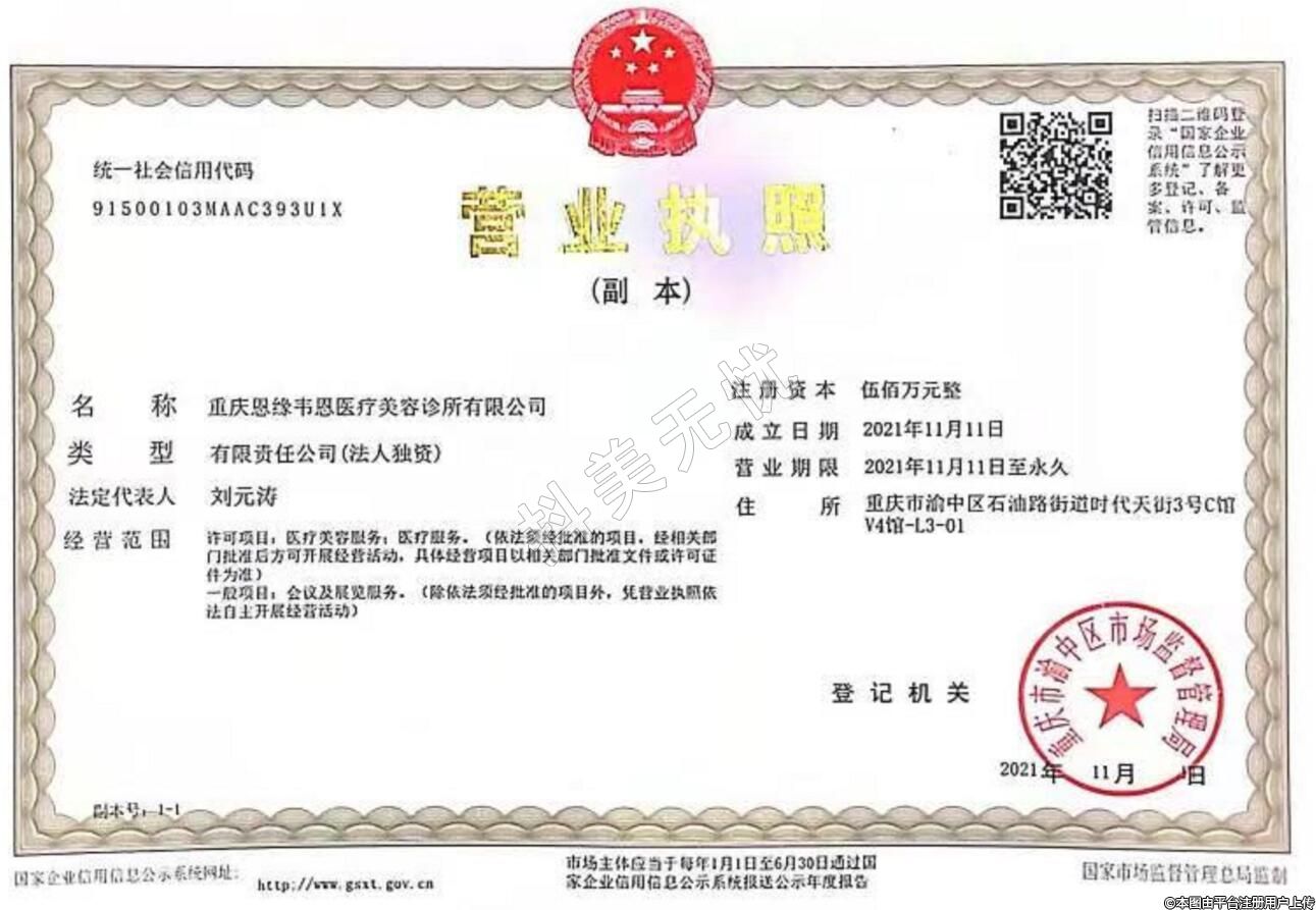 重慶恩緣韋恩醫(yī)療美容2021-11-11成立,地址:渝中區(qū)石油路街道時代天街3號C館V4館-L3-01,診療科目:醫(yī)療美容科 | 美容皮膚科******