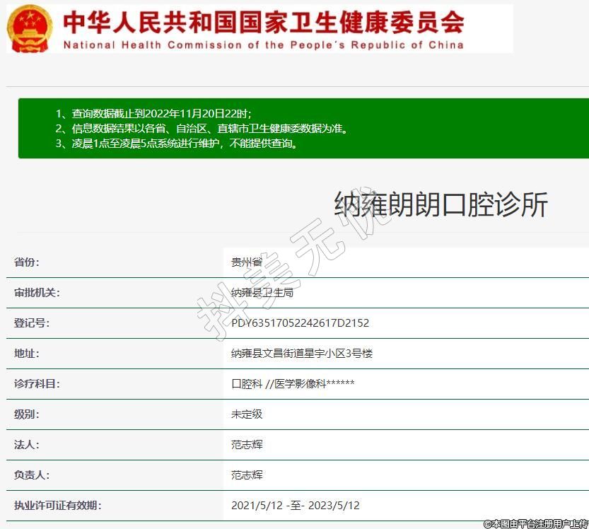 納雍朗朗口腔2021-04-01成立,地址:納雍縣文昌街道星宇小區(qū)3號樓,診療科目:口腔科 //醫(yī)學(xué)影像科******