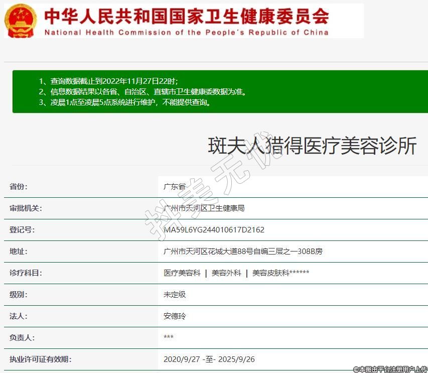 廣州斑夫人獵得醫(yī)療美容2017-04-07成立,診療科目:醫(yī)療美容科 | 美容外科 | 美容皮膚科******