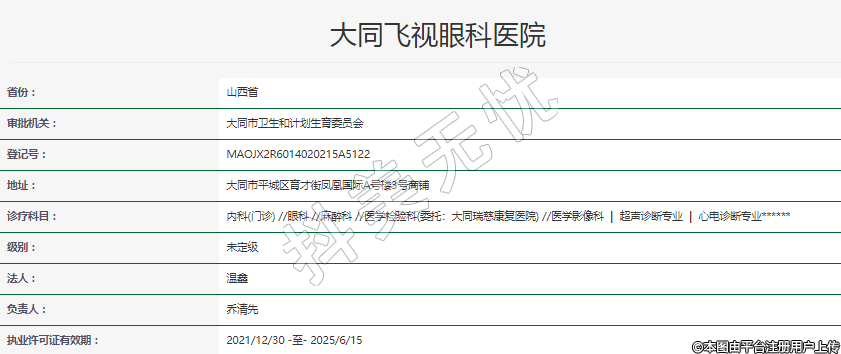 診療科目:內(nèi)科(門診) //眼科 //麻醉科 //醫(yī)學(xué)檢驗科(委托:大同瑞慈康復(fù)醫(yī)院) //醫(yī)學(xué)影像科 | 超聲診斷專業(yè) | 心電診斷專業(yè)******