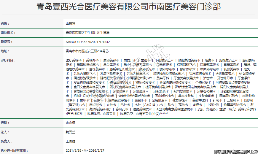 青島壹西光合醫(yī)療美容有限公司市南醫(yī)療美容門診部