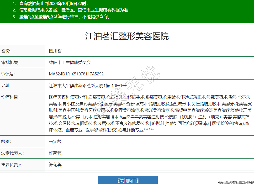 醫(yī)療美容科;美容外科;眉部美容術;眉提升術;修眉手術;眼部美容術;重瞼術;下瞼袋矯正術;鼻部美容術;隆鼻術;鼻尖美容術;鼻小柱及鼻孔美容術;頜面部美容術;顳部填充術;脂肪抽吸及腹壁成形術;負壓脂肪抽吸術;美容牙科;美容皮膚科;美容中醫(yī)科;美容醫(yī)療應用技術;物理美容治療術;激光美容治療術;高頻電美容治療;冷凍美容治療;其他物理美容治療;脫毛術;穿耳孔術;注射美容技術;A型肉毒毒素美容注射技術;皮膚(軟組織)注射(填充)美容;美容文飾技術;文眉技術;文眼線技術;文唇技術;不良文飾修復技術 | 麻醉科(其他許可信息詳見副本) | 醫(yī)學檢驗科(協(xié)議);臨床體液、血液專業(yè) | 醫(yī)學影像科(協(xié)議);心電診斷專業(yè)******