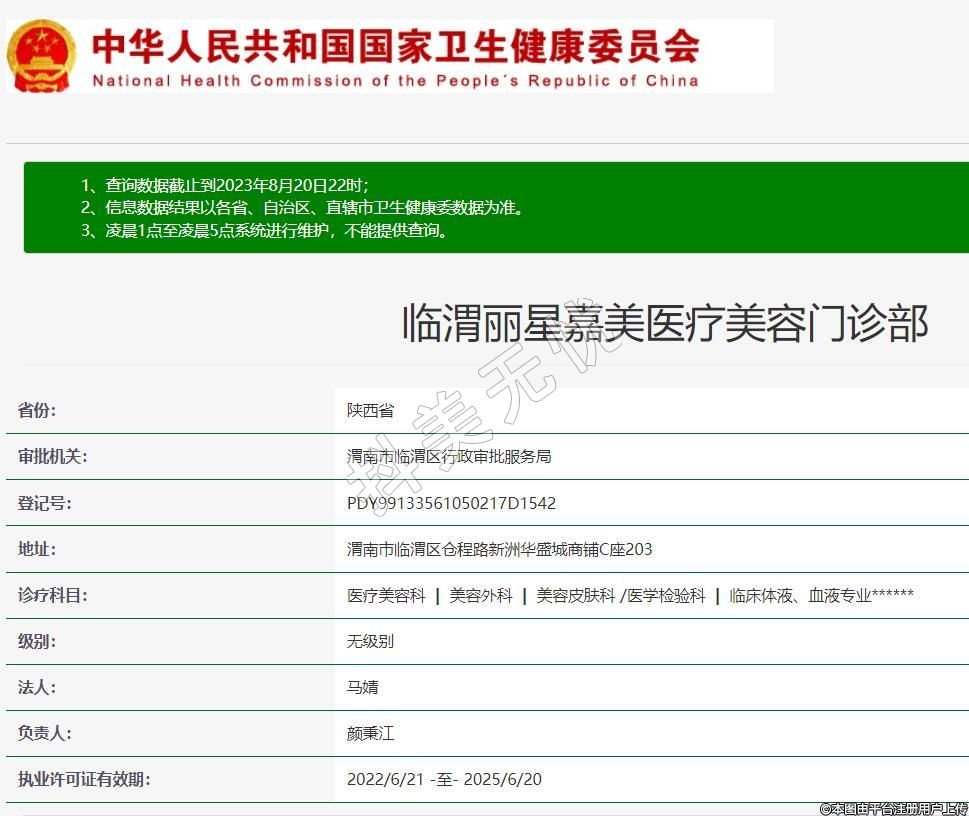 臨渭麗星嘉美醫(yī)療美容門診部,診療科目:醫(yī)療美容科 | 美容外科 | 美容皮膚科 /醫(yī)學(xué)檢驗(yàn)科 | 臨床體液、血液專業(yè)******