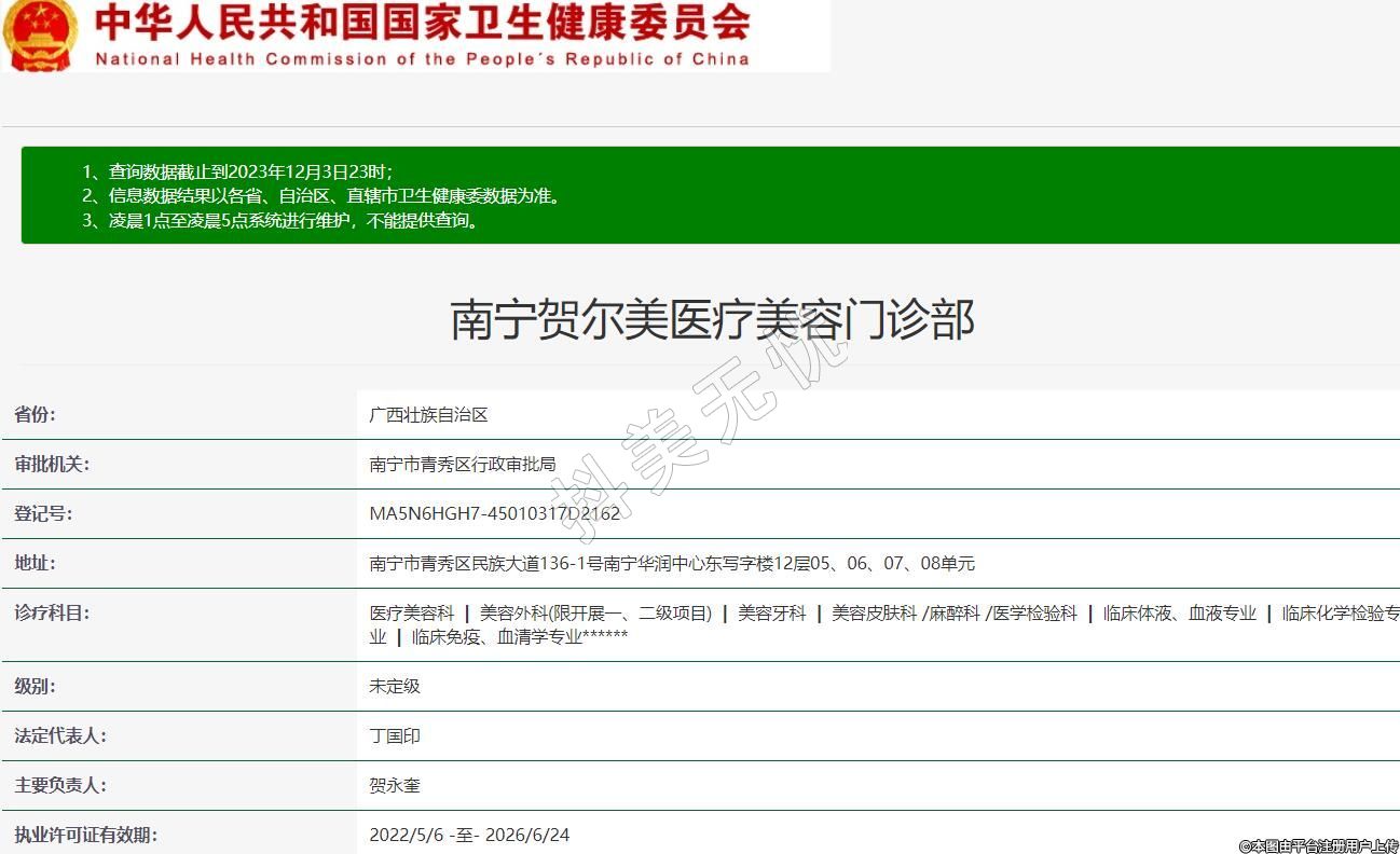 診療科目:醫(yī)療美容科 | 美容外科(限開展一、二級(jí)項(xiàng)目) | 美容牙科 | 美容皮膚科 /麻醉科 /醫(yī)學(xué)檢驗(yàn)科 | 臨床體液、血液專業(yè) | 臨床化學(xué)檢驗(yàn)專業(yè) | 臨床免疫、血清學(xué)專業(yè)******