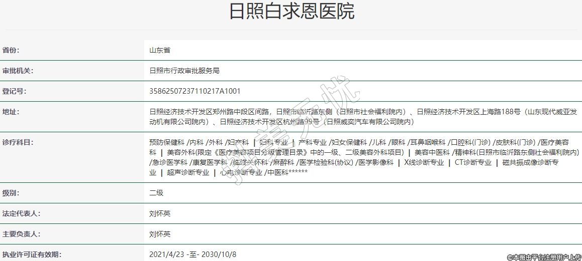 診療科目:預防保健科 /內科 /外科 /婦產科 | 婦科專業(yè) | 產科專業(yè) /婦女保健科 /兒科 /眼科 /耳鼻咽喉科 /口腔科(門診) /皮膚科(門診) /醫(yī)療美容科 | 美容外科(限定《醫(yī)療美容項目分級管理目錄》中的一級、二級美容外科項目) | 美容中醫(yī)科 /精神科(日照市臨沂路東側社會福利院內) /急診醫(yī)學科 /康復醫(yī)學科 /臨終關懷科 /麻醉科 /醫(yī)學檢驗科(協(xié)議) /醫(yī)學影像科 | X線診斷專業(yè) | CT診斷專業(yè) | 磁共振成像診斷專業(yè) | 超聲診斷專業(yè) | 心電診斷專業(yè) /中醫(yī)科******