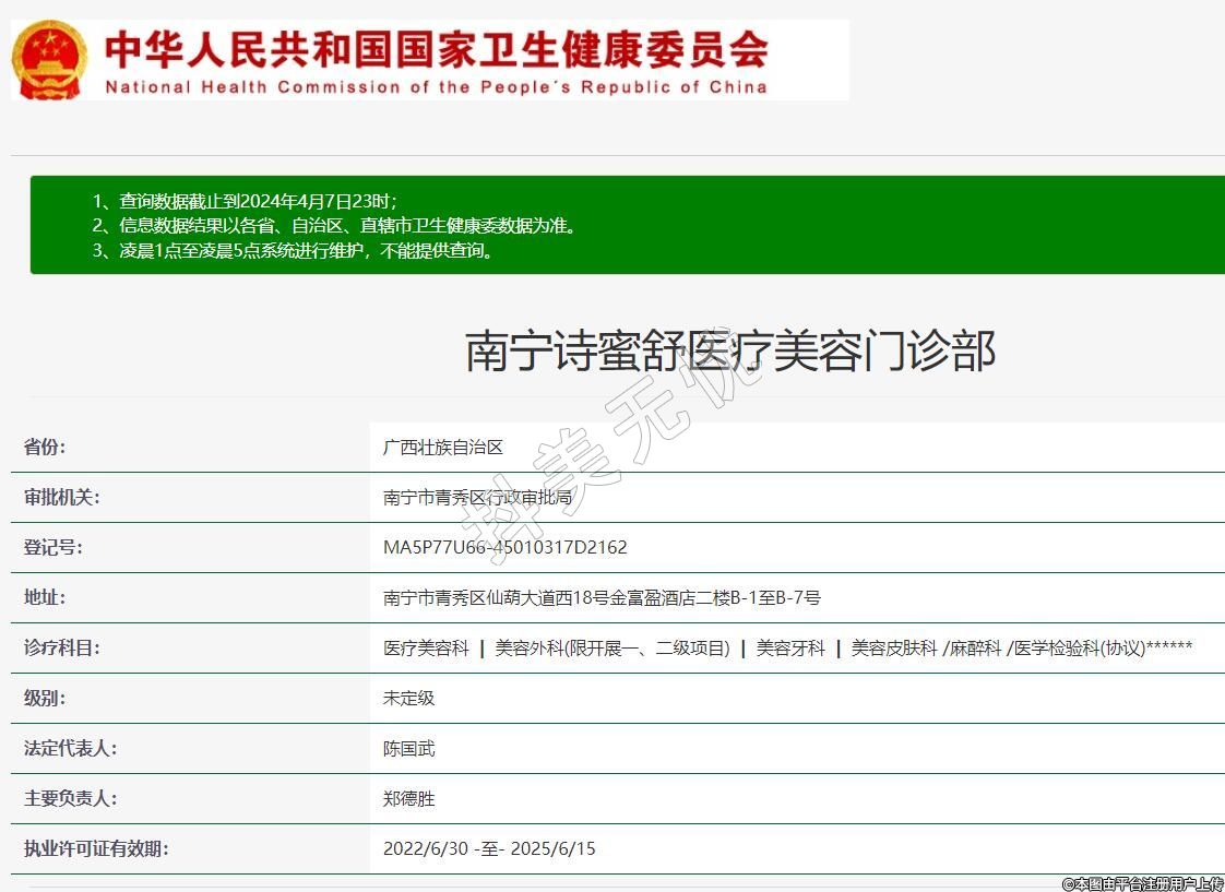 南寧詩蜜舒醫(yī)療美容門診部,診療科目:醫(yī)療美容科 | 美容外科(限開展一、二級項目) | 美容牙科 | 美容皮膚科 /麻醉科 /醫(yī)學檢驗科(協(xié)議)******