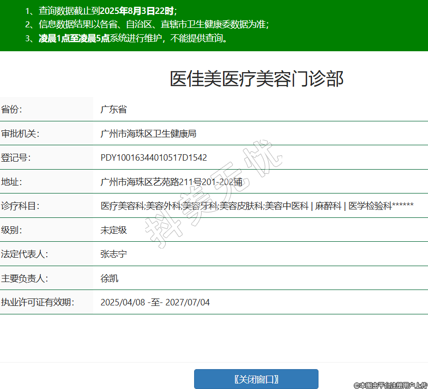 省份:廣東省審批機(jī)關(guān):廣州市海珠區(qū)衛(wèi)生健康局登記號(hào):PDY10016344010517D1542地址:廣州市海珠區(qū)藝苑路211號(hào)201-202鋪診療科目:醫(yī)療美容科;美容外科;美容牙科;美容皮膚科;美容中醫(yī)科 | 麻醉科 | 醫(yī)學(xué)檢驗(yàn)科******級(jí)別:未定級(jí)法定代表人:張志寧主要負(fù)責(zé)人:徐凱執(zhí)業(yè)許可證有效期:2025/04/08 -至- 2027/07/04 -