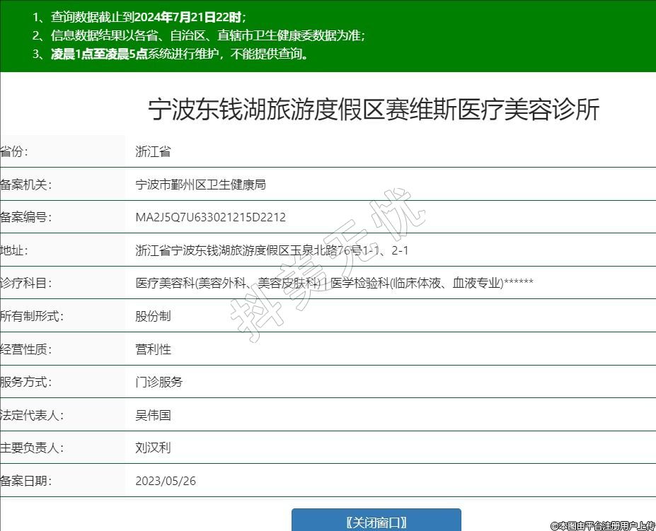 寧波東錢湖旅游度假區(qū)賽維斯醫(yī)療美容診所,診療科目:醫(yī)療美容科(美容外科、美容皮膚科) | 醫(yī)學檢驗科(臨床體液、血液專業(yè))******