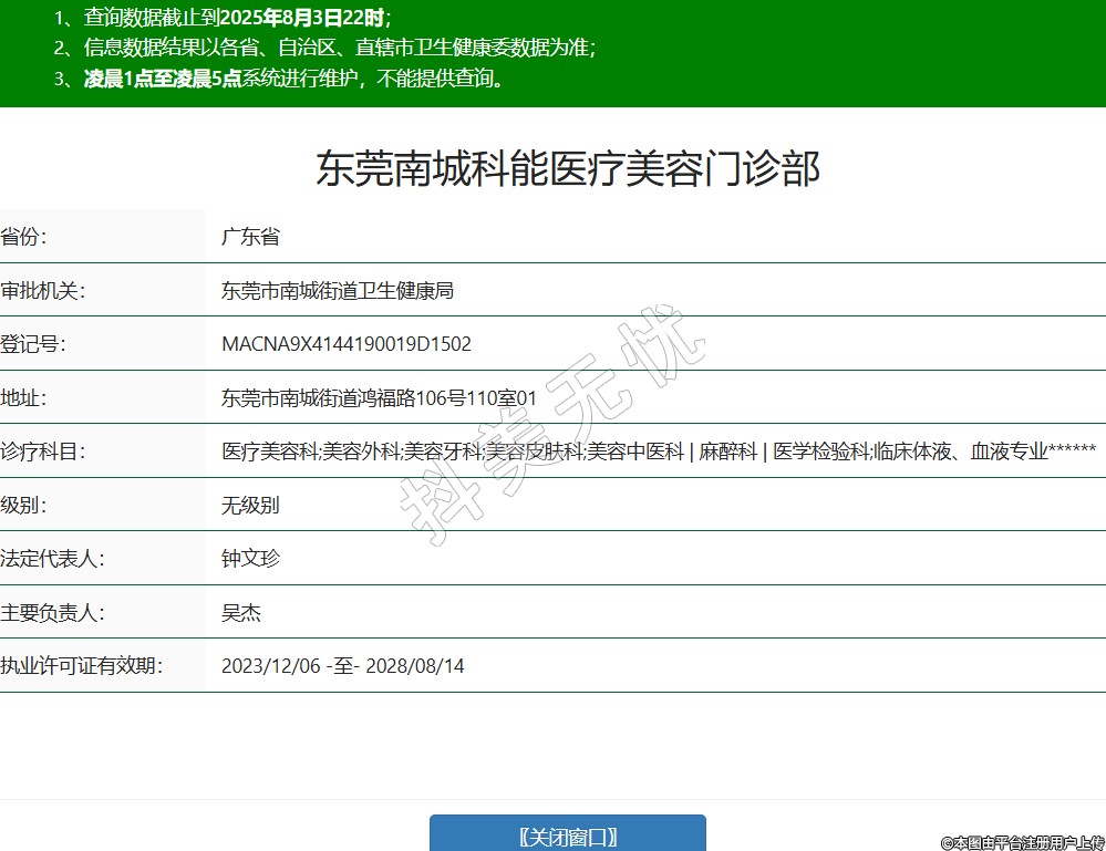 省份:廣東省審批機關:東莞市南城街道衛(wèi)生健康局登記號:MACNA9X4144190019D1502地址:東莞市南城街道鴻福路106號110室01診療科目:醫(yī)療美容科;美容外科;美容牙科;美容皮膚科;美容中醫(yī)科 | 麻醉科 | 醫(yī)學檢驗科;臨床體液、血液專業(yè)******級別:無級別法定代表人:鐘文珍主要負責人:吳杰執(zhí)業(yè)許可證有效期:2023/12/06 -至- 2028/08/14 -