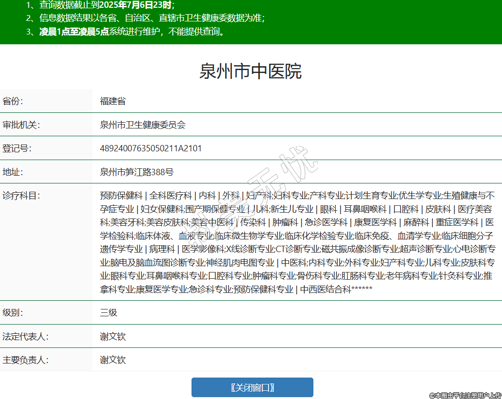 省份:福建省審批機關(guān):泉州市衛(wèi)生健康委員會登記號:48924007635050211A2101地址:泉州市筍江路388號診療科目:預(yù)防保健科 | 全科醫(yī)療科 | 內(nèi)科 | 外科 | 婦產(chǎn)科;婦科專業(yè);產(chǎn)科專業(yè);計劃生育專業(yè);優(yōu)生學(xué)專業(yè);生殖健康與不孕癥專業(yè) | 婦女保健科;圍產(chǎn)期保健專業(yè) | 兒科;新生兒專業(yè) | 眼科 | 耳鼻咽喉科 | 口腔科 | 皮膚科 | 醫(yī)療美容科;美容牙科;美容皮膚科;美容中醫(yī)科 | 傳染科 | 腫瘤科 | 急診醫(yī)學(xué)科 | 康復(fù)醫(yī)學(xué)科 | 麻醉科 | 重癥醫(yī)學(xué)科 | 醫(yī)學(xué)檢驗科;臨床體液、血液專業(yè);臨床微生物學(xué)專業(yè);臨床化學(xué)檢驗專業(yè);臨床免疫、血清學(xué)專業(yè);臨床細胞分子遺傳學(xué)專業(yè) | 病理科 | 醫(yī)學(xué)影像科;X線診斷專業(yè);CT診斷專業(yè);磁共振成像診斷專業(yè);超聲診斷專業(yè);心電診斷專業(yè);腦電及腦血流圖診斷專業(yè);神經(jīng)肌肉電圖專業(yè) | 中醫(yī)科;內(nèi)科專業(yè);外科專業(yè);婦產(chǎn)科專業(yè);兒科專業(yè);皮膚科專業(yè);眼科專業(yè);耳鼻咽喉科專業(yè);口腔科專業(yè);腫瘤科專業(yè);骨傷科專業(yè);肛腸科專業(yè);老年病科專業(yè);針灸科專業(yè);推拿科專業(yè);康復(fù)醫(yī)學(xué)專業(yè);急診科專業(yè);預(yù)防保健科專業(yè) | 中西醫(yī)結(jié)合科******級別:三級法定代表人:謝文欽主要負責(zé)人:謝文欽執(zhí)業(yè)許可證有效期:2022/07/22 -至- 2028/07/21 -