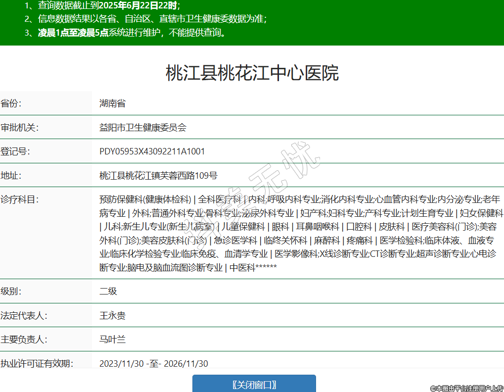 省份:湖南省審批機(jī)關(guān):益陽市衛(wèi)生健康委員會(huì)登記號(hào):PDY05953X43092211A1001地址:桃江縣桃花江鎮(zhèn)芙蓉西路109號(hào)診療科目:預(yù)防保健科(健康體檢科) | 全科醫(yī)療科 | 內(nèi)科;呼吸內(nèi)科專業(yè);消化內(nèi)科專業(yè);心血管內(nèi)科專業(yè);內(nèi)分泌專業(yè);老年病專業(yè) | 外科;普通外科專業(yè);骨科專業(yè);泌尿外科專業(yè) | 婦產(chǎn)科;婦科專業(yè);產(chǎn)科專業(yè);計(jì)劃生育專業(yè) | 婦女保健科 | 兒科;新生兒專業(yè)(新生兒病室) | 兒童保健科 | 眼科 | 耳鼻咽喉科 | 口腔科 | 皮膚科 | 醫(yī)療美容科(門診);美容外科(門診);美容皮膚科(門診) | 急診醫(yī)學(xué)科 | 臨終關(guān)懷科 | 麻醉科 | 疼痛科 | 醫(yī)學(xué)檢驗(yàn)科;臨床體液、血液專業(yè);臨床化學(xué)檢驗(yàn)專業(yè);臨床免疫、血清學(xué)專業(yè) | 醫(yī)學(xué)影像科;X線診斷專業(yè);CT診斷專業(yè);超聲診斷專業(yè);心電診斷專業(yè);腦電及腦血流圖診斷專業(yè) | 中醫(yī)科******級(jí)別:二級(jí)法定代表人:王永貴主要負(fù)責(zé)人:馬葉蘭執(zhí)業(yè)許可證有效期:2023/11/30 -至- 2026/11/30 -