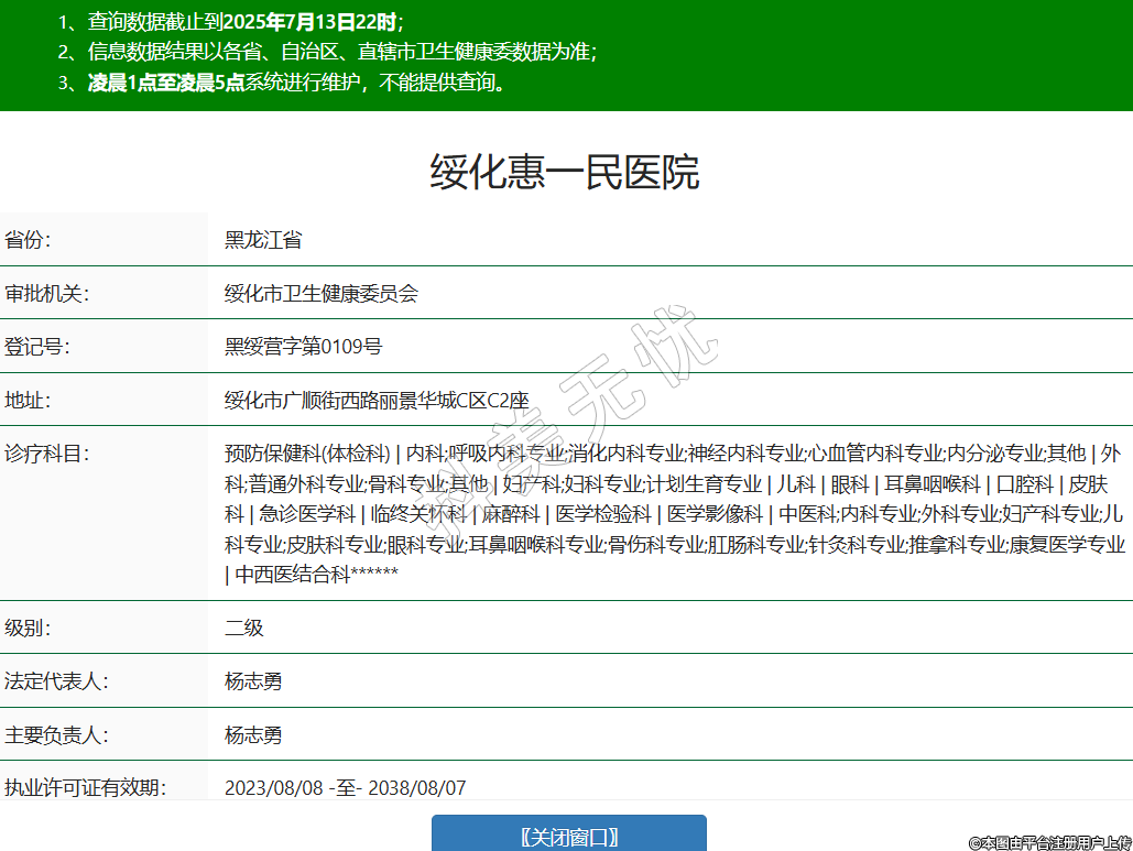 省份:黑龍江省審批機關(guān):綏化市衛(wèi)生健康委員會登記號:黑綏營字第0109號地址:綏化市廣順街西路麗景華城C區(qū)C2座診療科目:預(yù)防保健科(體檢科) | 內(nèi)科;呼吸內(nèi)科專業(yè);消化內(nèi)科專業(yè);神經(jīng)內(nèi)科專業(yè);心血管內(nèi)科專業(yè);內(nèi)分泌專業(yè);其他 | 外科;普通外科專業(yè);骨科專業(yè);其他 | 婦產(chǎn)科;婦科專業(yè);計劃生育專業(yè) | 兒科 | 眼科 | 耳鼻咽喉科 | 口腔科 | 皮膚科 | 急診醫(yī)學(xué)科 | 臨終關(guān)懷科 | 麻醉科 | 醫(yī)學(xué)檢驗科 | 醫(yī)學(xué)影像科 | 中醫(yī)科;內(nèi)科專業(yè);外科專業(yè);婦產(chǎn)科專業(yè);兒科專業(yè);皮膚科專業(yè);眼科專業(yè);耳鼻咽喉科專業(yè);骨傷科專業(yè);肛腸科專業(yè);針灸科專業(yè);推拿科專業(yè);康復(fù)醫(yī)學(xué)專業(yè) | 中西醫(yī)結(jié)合科******級別:二級法定代表人:楊志勇主要負責(zé)人:楊志勇執(zhí)業(yè)許可證有效期:2023/08/08 -至- 2038/08/07 -
