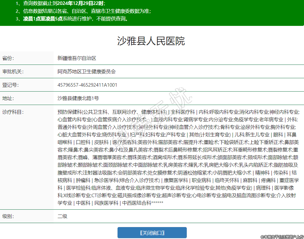 預(yù)防保健科(公共衛(wèi)生科、互聯(lián)網(wǎng)診療、健康體檢科) | 全科醫(yī)療科 | 內(nèi)科;呼吸內(nèi)科專業(yè);消化內(nèi)科專業(yè);神經(jīng)內(nèi)科專業(yè);心血管內(nèi)科專業(yè)(心血管疾病介入診療技術(shù)、);血液內(nèi)科專業(yè);腎病學(xué)專業(yè);內(nèi)分泌專業(yè);免疫學(xué)專業(yè);老年病專業(yè) | 外科;普通外科專業(yè)(外周血管介入診療技術(shù));神經(jīng)外科專業(yè)(神經(jīng)血管介入診療技術(shù));骨科專業(yè);泌尿外科專業(yè);胸外科專業(yè);心臟大血管外科專業(yè);燒傷科專業(yè) | 婦產(chǎn)科;婦科專業(yè);產(chǎn)科專業(yè) | 其他(計(jì)劃生育專業(yè)) | 兒科;新生兒專業(yè) | 眼科 | 耳鼻咽喉科 | 口腔科 | 皮膚科 | 醫(yī)療美容科;美容外科;眉部美容術(shù);眉提升術(shù);重瞼術(shù);下瞼袋矯正術(shù);上瞼下垂矯正術(shù);鼻部美容術(shù);隆鼻術(shù);鼻尖美容術(shù);鼻小柱及鼻孔美容術(shù);唇裂術(shù)后鼻畸形修復(fù)術(shù);招風(fēng)耳矯正術(shù);耳垂畸形修復(fù)術(shù);唇裂修復(fù)術(shù);重唇美容術(shù);唇峰、薄唇增厚美容術(shù);唇珠美容術(shù);酒窩成形術(shù);唇系帶延長(zhǎng)成形術(shù);頜面部美容術(shù);頦成形術(shù);面部除皺術(shù);額部除皺術(shù);顳部除皺術(shù);面頸部除皺術(shù);中面部除皺術(shù);乳房美容術(shù);隆乳術(shù);乳房肥大縮小術(shù);乳頭內(nèi)陷矯正術(shù);脂肪抽吸及腹壁成形術(shù);注射器法吸脂術(shù);會(huì)陰部美容術(shù);處女膜修復(fù)術(shù);陰道松弛縮緊術(shù);小陰唇肥大縮小術(shù) | 精神科 | 傳染科 | 結(jié)核病科 | 腫瘤科 | 急診醫(yī)學(xué)科(綜合介入診療技術(shù)) | 康復(fù)醫(yī)學(xué)科 | 職業(yè)病科 | 臨終關(guān)懷科 | 麻醉科 | 疼痛科 | 重癥醫(yī)學(xué)科 | 醫(yī)學(xué)檢驗(yàn)科;臨床體液、血液專業(yè);臨床微生物學(xué)專業(yè);臨床化學(xué)檢驗(yàn)專業(yè);其他(免疫學(xué)專業(yè)) | 病理科 | 醫(yī)學(xué)影像科;X線診斷專業(yè);CT診斷專業(yè);磁共振成像診斷專業(yè);超聲診斷專業(yè);心電診斷專業(yè);腦電及腦血流圖診斷專業(yè);介入放射學(xué)專業(yè) | 中醫(yī)科 | 民族醫(yī)學(xué)科 | 中西醫(yī)結(jié)合科******