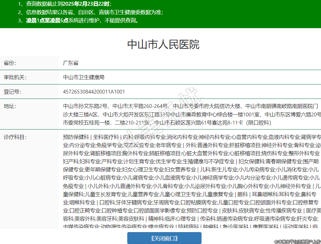 中山市孫文東路2號(hào)、中山市太平路260-264號(hào)、中山市市委市府大院信訪大樓、中山市南朗鎮(zhèn)南岐路南朗醫(yī)院門(mén)診大樓三樓A區(qū)、中山市火炬開(kāi)發(fā)區(qū)東江路33號(hào)中山市廉政教育中心綜合樓一樓1001室、中山市東區(qū)博愛(ài)六路20號(hào)市委黨校五桂苑一樓,二樓210-211室、中山市石岐區(qū)蓮興路61號(hào)喜達(dá)苑8-11卡(限口腔科)