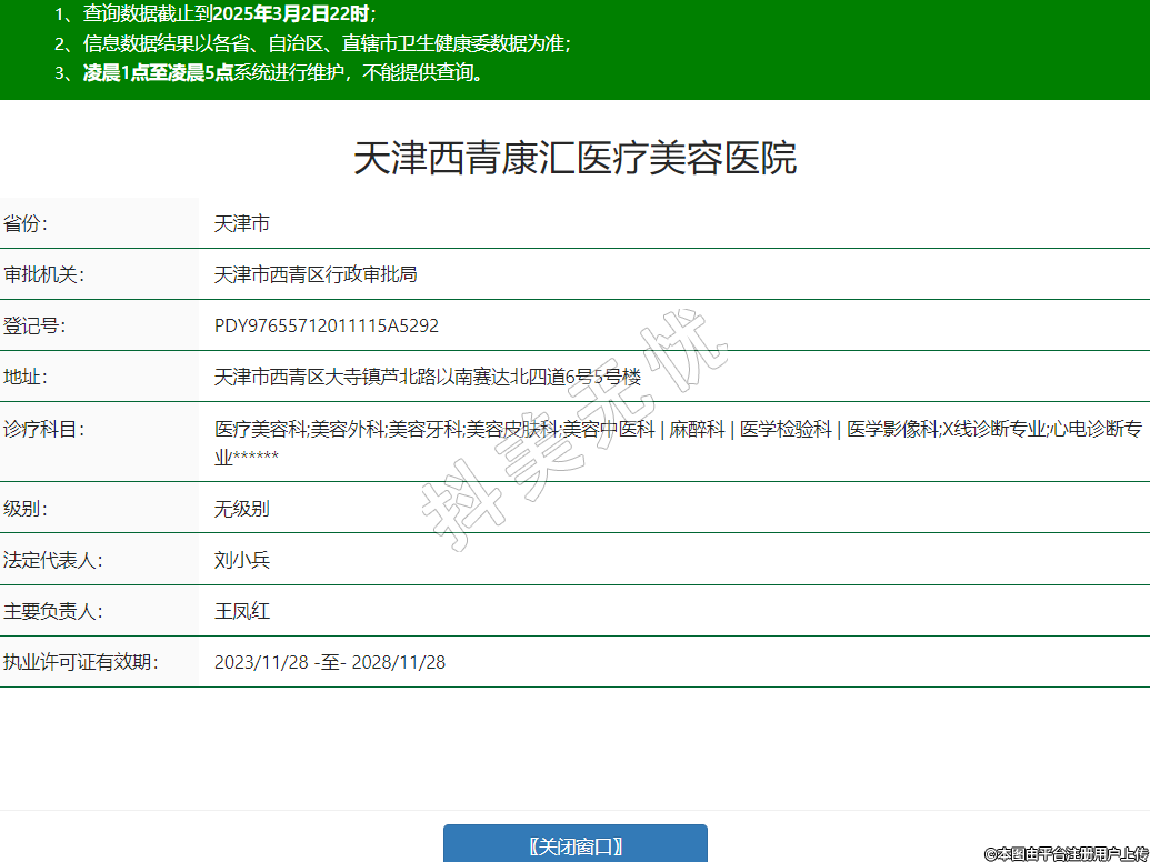 天津西青康匯醫(yī)療美容醫(yī)院,診療科目:醫(yī)療美容科;美容外科;美容牙科;美容皮膚科;美容中醫(yī)科 | 麻醉科 | 醫(yī)學檢驗科 | 醫(yī)學影像科;X線診斷專業(yè);心電診斷專業(yè)******
