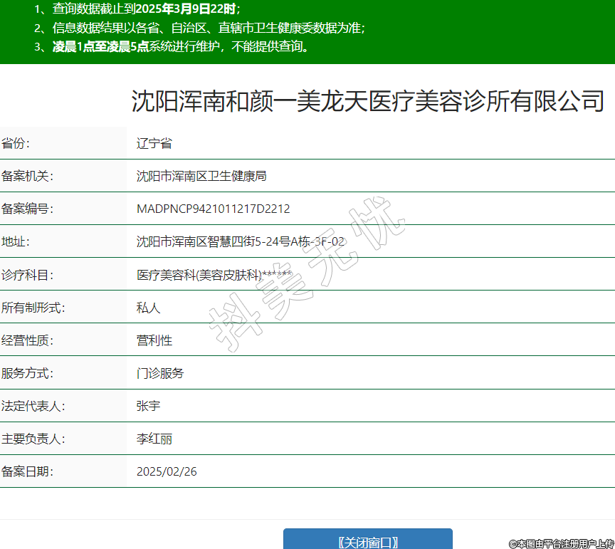 沈陽渾南和顏一美龍?zhí)灬t(yī)療美容診所有限公司,診療科目:醫(yī)療美容科(美容皮膚科)******