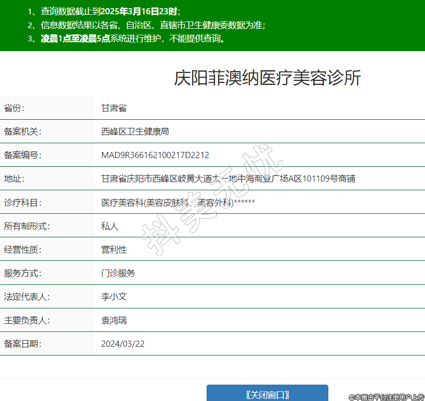 慶陽菲澳納醫(yī)療美容診所,診療科目:醫(yī)療美容科(美容皮膚科、美容外科)******
