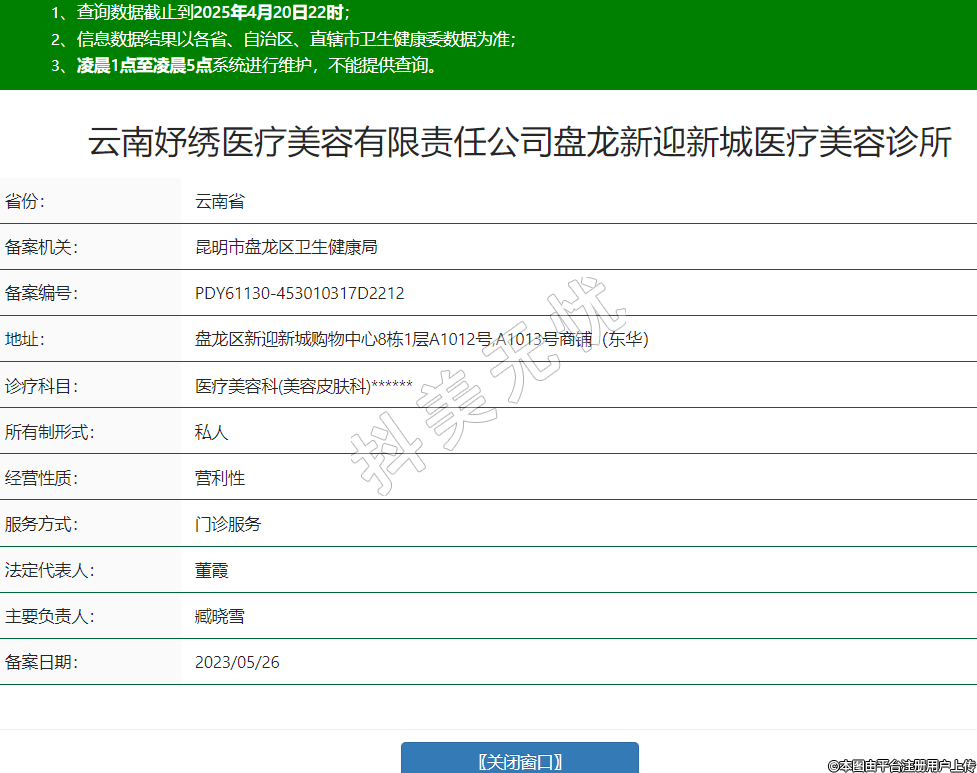 云南妤繡醫(yī)療美容有限責(zé)任公司盤龍新迎新城醫(yī)療美容診所,診療科目:醫(yī)療美容科(美容皮膚科)******