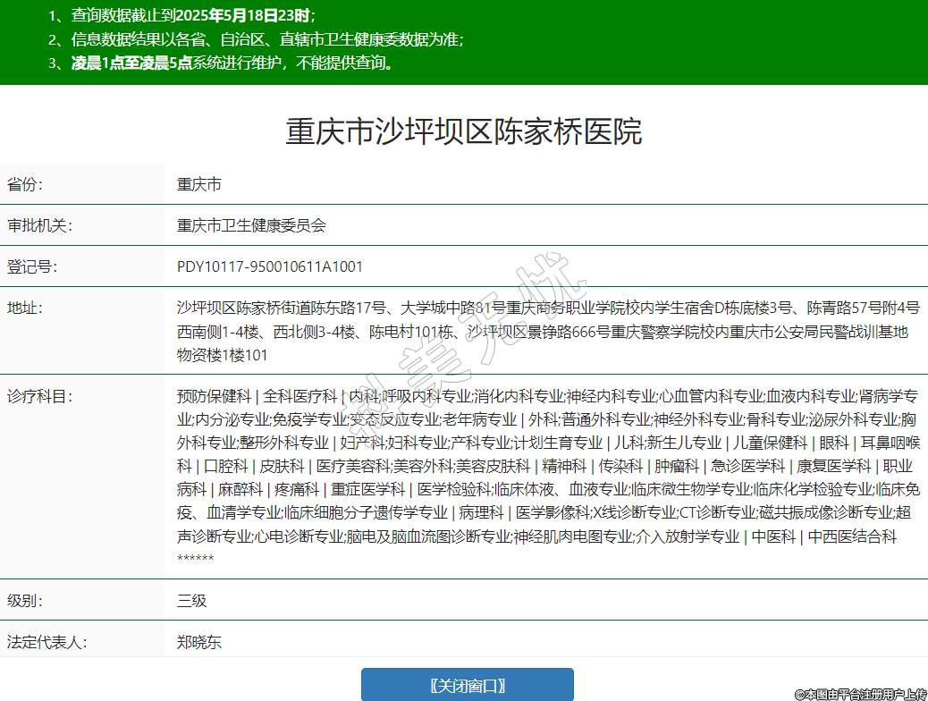 省份:重慶市審批機(jī)關(guān):重慶市衛(wèi)生健康委員會(huì)登記號(hào):PDY10117-950010611A1001地址:沙坪壩區(qū)陳家橋街道陳東路17號(hào)、大學(xué)城中路81號(hào)重慶商務(wù)職業(yè)學(xué)院校內(nèi)學(xué)生宿舍D棟底樓3號(hào)、陳青路57號(hào)附4號(hào)西南側(cè)1-4樓、西北側(cè)3-4樓、陳電村101棟、沙坪壩區(qū)景錚路666號(hào)重慶警察學(xué)院校內(nèi)重慶市公安局民警戰(zhàn)訓(xùn)基地物資樓1樓101診療科目:預(yù)防保健科 | 全科醫(yī)療科 | 內(nèi)科;呼吸內(nèi)科專業(yè);消化內(nèi)科專業(yè);神經(jīng)內(nèi)科專業(yè);心血管內(nèi)科專業(yè);血液內(nèi)科專業(yè);腎病學(xué)專業(yè);內(nèi)分泌專業(yè);免疫學(xué)專業(yè);變態(tài)反應(yīng)專業(yè);老年病專業(yè) | 外科;普通外科專業(yè);神經(jīng)外科專業(yè);骨科專業(yè);泌尿外科專業(yè);胸外科專業(yè);整形外科專業(yè) | 婦產(chǎn)科;婦科專業(yè);產(chǎn)科專業(yè);計(jì)劃生育專業(yè) | 兒科;新生兒專業(yè) | 兒童保健科 | 眼科 | 耳鼻咽喉科 | 口腔科 | 皮膚科 | 醫(yī)療美容科;美容外科;美容皮膚科 | 精神科 | 傳染科 | 腫瘤科 | 急診醫(yī)學(xué)科 | 康復(fù)醫(yī)學(xué)科 | 職業(yè)病科 | 麻醉科 | 疼痛科 | 重癥醫(yī)學(xué)科 | 醫(yī)學(xué)檢驗(yàn)科;臨床體液、血液專業(yè);臨床微生物學(xué)專業(yè);臨床化學(xué)檢驗(yàn)專業(yè);臨床免疫、血清學(xué)專業(yè);臨床細(xì)胞分子遺傳學(xué)專業(yè) | 病理科 | 醫(yī)學(xué)影像科;X線診斷專業(yè);CT診斷專業(yè);磁共振成像診斷專業(yè);超聲診斷專業(yè);心電診斷專業(yè);腦電及腦血流圖診斷專業(yè);神經(jīng)肌肉電圖專業(yè);介入放射學(xué)專業(yè) | 中醫(yī)科 | 中西醫(yī)結(jié)合科******級(jí)別:三級(jí)法定代表人:鄭曉東主要負(fù)責(zé)人:鄭曉東執(zhí)業(yè)許可證有效期:2024/12/05 -至- 2036/04/29 -