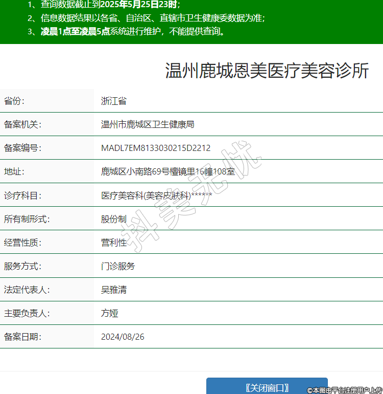 省份:浙江省備案機(jī)關(guān):溫州市鹿城區(qū)衛(wèi)生健康局備案編號(hào):MADL7EM8133030215D2212地址:鹿城區(qū)小南路69號(hào)檀鏡里16幢108室診療科目:醫(yī)療美容科(美容皮膚科)******所有制形式:股份制經(jīng)營性質(zhì):營利性服務(wù)方式:門診服務(wù)法定代表人:吳雅清主要負(fù)責(zé)人:方婭備案日期:2024/08/26 -