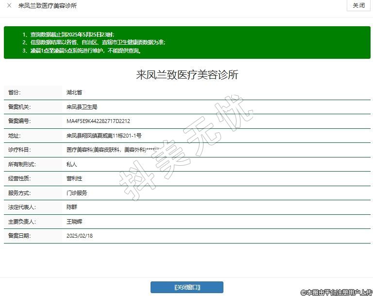來鳳縣蘭致整形醫(yī)院是一家正規(guī)的、靠譜的醫(yī)美機(jī)構(gòu),來鳳縣蘭致醫(yī)療美容診所成立于2021年12月06日,注冊地位于湖北省來鳳縣翔鳳鎮(zhèn)夏威夷11棟201-1(自主申報(bào)承諾),法定代表人為陳群。