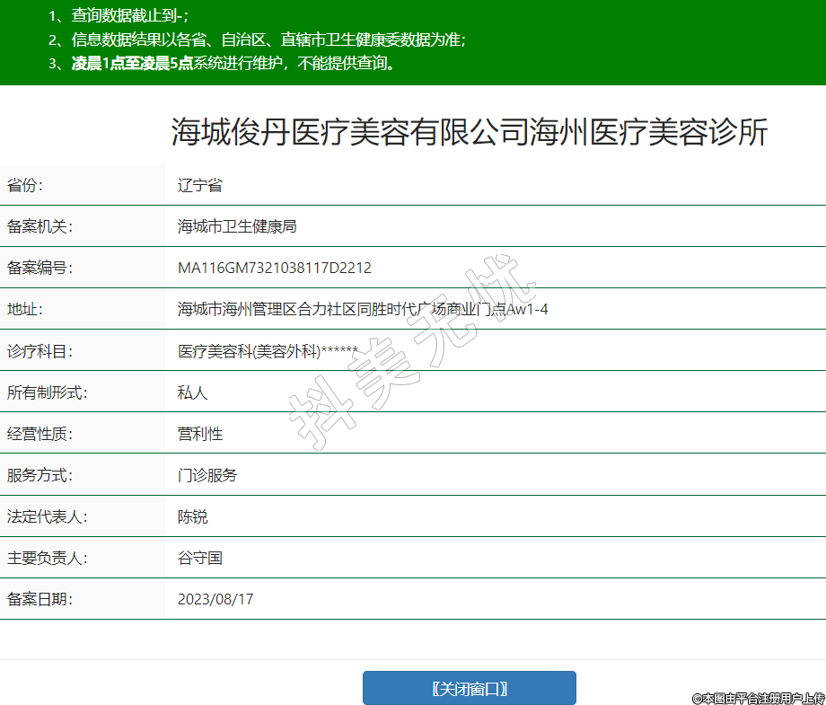 省份:遼寧省備案機(jī)關(guān):海城市衛(wèi)生健康局備案編號(hào):MA116GM7321038117D2212地址:海城市海州管理區(qū)合力社區(qū)同勝時(shí)代廣場(chǎng)商業(yè)門(mén)點(diǎn)Aw1-4診療科目:醫(yī)療美容科(美容外科)******所有制形式:私人經(jīng)營(yíng)性質(zhì):營(yíng)利性服務(wù)方式:門(mén)診服務(wù)法定代表人:陳銳主要負(fù)責(zé)人:谷守國(guó)備案日期:2023/08/17 -