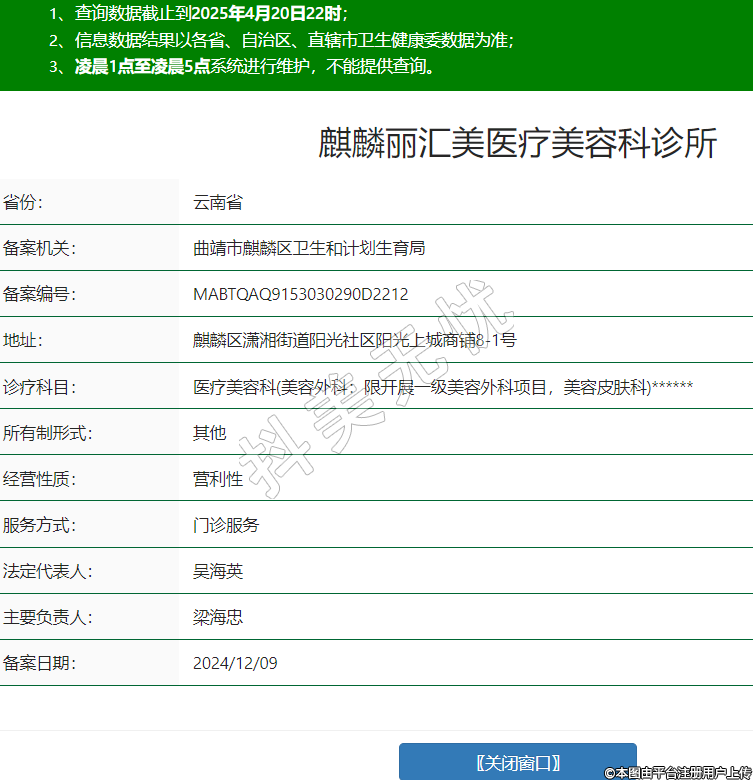 麒麟麗匯美醫(yī)療美容科診所,診療科目:醫(yī)療美容科(美容外科:限開展一級美容外科項目,美容皮膚科)******