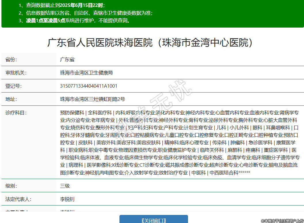 省份:廣東省審批機關(guān):珠海市金灣區(qū)衛(wèi)生健康局登記號:31507713344040411A1001地址:珠海市金灣區(qū)三灶鎮(zhèn)虹陽路2號診療科目:預(yù)防保健科 | 全科醫(yī)療科 | 內(nèi)科;呼吸內(nèi)科專業(yè);消化內(nèi)科專業(yè);神經(jīng)內(nèi)科專業(yè);心血管內(nèi)科專業(yè);血液內(nèi)科專業(yè);腎病學(xué)專業(yè);內(nèi)分泌專業(yè);老年病專業(yè) | 外科;普通外科專業(yè);神經(jīng)外科專業(yè);骨科專業(yè);泌尿外科專業(yè);胸外科專業(yè);心臟大血管外科專業(yè);燒傷科專業(yè);整形外科專業(yè) | 婦產(chǎn)科;婦科專業(yè);產(chǎn)科專業(yè);計劃生育專業(yè) | 兒科 | 小兒外科 | 眼科 | 耳鼻咽喉科 | 口腔科;牙體牙髓病專業(yè);牙周病專業(yè);口腔粘膜病專業(yè);兒童口腔專業(yè);口腔修復(fù)專業(yè);口腔正畸專業(yè);口腔種植專業(yè);預(yù)防口腔專業(yè) | 皮膚科 | 美容外科;美容牙科;美容皮膚科 | 精神科;臨床心理專業(yè) | 傳染科 | 腫瘤科 | 急診醫(yī)學(xué)科 | 康復(fù)醫(yī)學(xué)科 | 職業(yè)病科;職業(yè)中毒專業(yè);物理因素損傷專業(yè);職業(yè)健康監(jiān)護專業(yè) | 臨終關(guān)懷科 | 麻醉科 | 疼痛科 | 重癥醫(yī)學(xué)科 | 醫(yī)學(xué)檢驗科;臨床體液、血液專業(yè);臨床微生物學(xué)專業(yè);臨床化學(xué)檢驗專業(yè);臨床免疫、血清學(xué)專業(yè);臨床細胞分子遺傳學(xué)專業(yè) | 病理科 | 醫(yī)學(xué)影像科;X線診斷專業(yè);CT診斷專業(yè);磁共振成像診斷專業(yè);超聲診斷專業(yè);心電診斷專業(yè);腦電及腦血流圖診斷專業(yè);神經(jīng)肌肉電圖專業(yè);介入放射學(xué)專業(yè);放射治療專業(yè) | 中醫(yī)科 | 中西醫(yī)結(jié)合科******級別:三級法定代表人:李銳釗主要負責人:李銳釗執(zhí)業(yè)許可證有效期:2016/09/19 -至- 2031/09/18 -